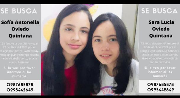 Sara Lucía y Sofía Antonella Oviedo Quintana son dos menores de edad, de 12 y 13 años que se encuentran desaparecidas en el norte de Quito desde el jueves 22 de abril del 2021, sus padres están desesperados porque no se sabe nada de su paradero.