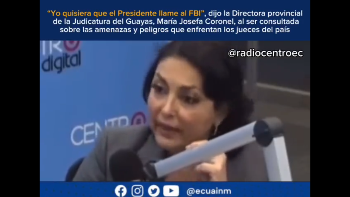 La directora provincial del Consejo de la Judicatura de Guayas, María Josefa Coronel, dio una impactante respuesta a la pregunta que el entrevistador le hizo sobre cómo se sienten los jueces ante la situación de inseguridad que se vive: “Yo quisiera que el presidente Lasso llame al FBI”.