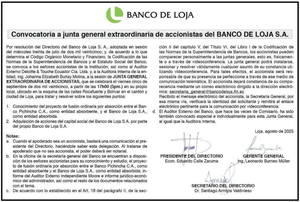 En un giro inesperado en el sector financiero ecuatoriano, el Banco de Loja S.A. ha convocado a sus accionistas a una junta general extraordinaria programada para el 5 de septiembre de 2025. El principal tema a tratar será un proyecto de fusión por absorción con Banco Pichincha C.A., donde el primero actuaría como entidad absorbida y el segundo como entidad absorbente.