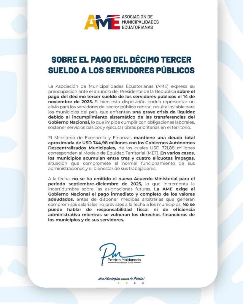 La Asociación de Municipalidades del Ecuador (AME) expresa su preocupación, por el anuncio del presidente Daniel Noboa sobre el pago del decimotercer mes de salario a los servidores públicos el 14 de noviembre. Si bien la medida representa un alivio para el sector público central, los municipios enfrentan una grave crisis de liquidez debido a los retrasos sistemáticos en las transferencias del Gobierno Nacional, lo que compromete el cumplimiento de las obligaciones laborales, la prestación de servicios básicos y la ejecución de proyectos prioritarios.