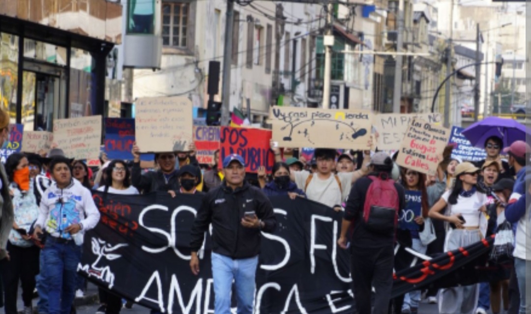 Grupos sociales se reunieron la tarde del miércoles 8 de octubre de 2025 para protestar contra el Gobierno nacional por la eliminación del subsidio al diésel. El punto de encuentro fue la avenida 10 de Agosto, cerca del parque El Ejido, desde donde se desplazaron hacia el sur.