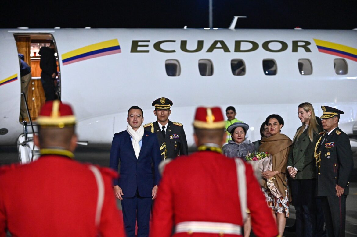 La salida de Noboa desde Quito fue formalizada mediante un decreto ejecutivo en el que se declaró en comisión de servicios, es decir, en funciones oficiales, a los miembros de la comitiva, trámite que autorizó su desplazamiento y la logística del viaje. El decreto, firmado el 6 de noviembre, se produjo en un contexto político doméstico marcado por la campaña por la consulta popular y el referendo, lo que generó reacciones y cuestionamientos desde algunos sectores sobre la coincidencia de agenda.