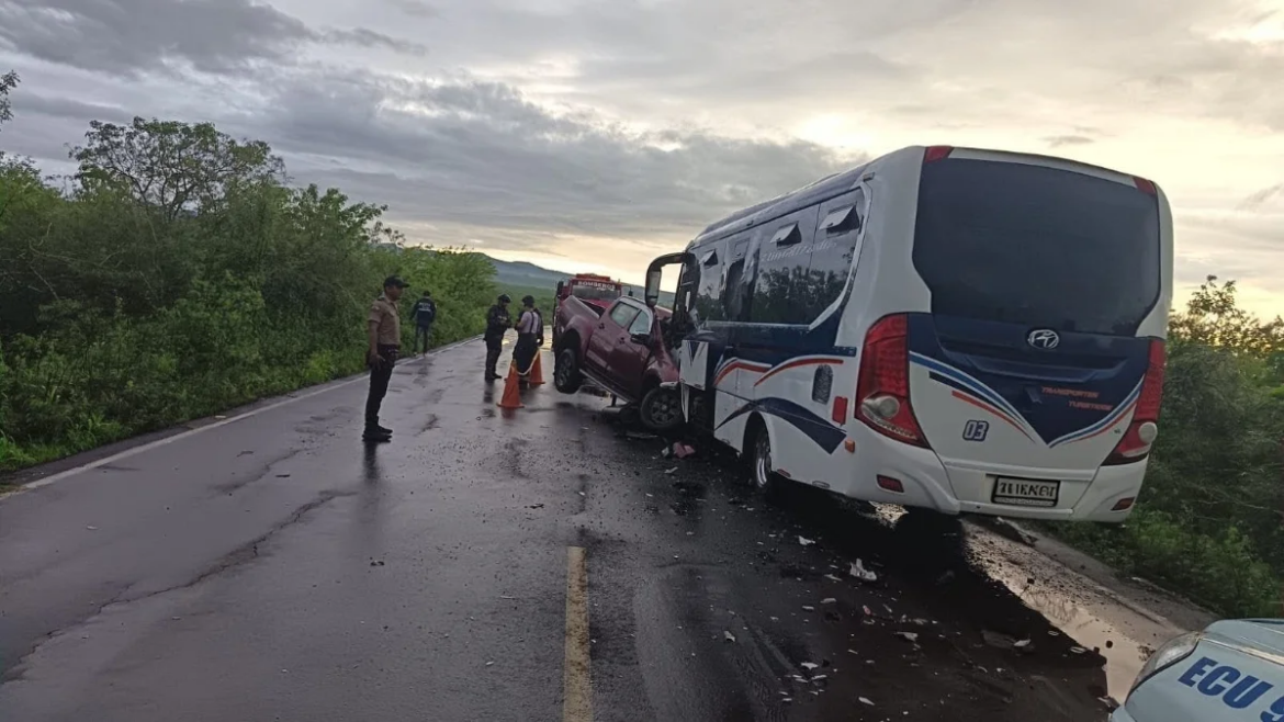 En la carretera a Baltra, en el cantón Santa Cruz, una camioneta fue impactada de frente por un autobús turístico.